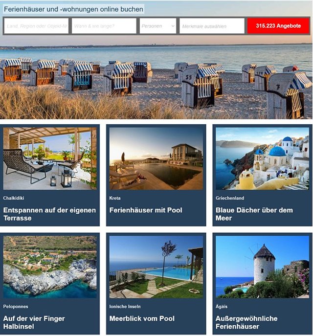 Hier finden Sie deutsche und internationale Ferienwohnungen, Ferienhäuser, Ferienapartments, Villen, Bungalows, Fincas und mehr! Dazu Informationen und Tipps zu Menschen, Landschaft, Kultur, Sehenswürdigkeiten, Ausflugszielen etc. zu den Ziel- und Urlaubsgebieten! Bitte beachten Sie den Provisionshinweis.